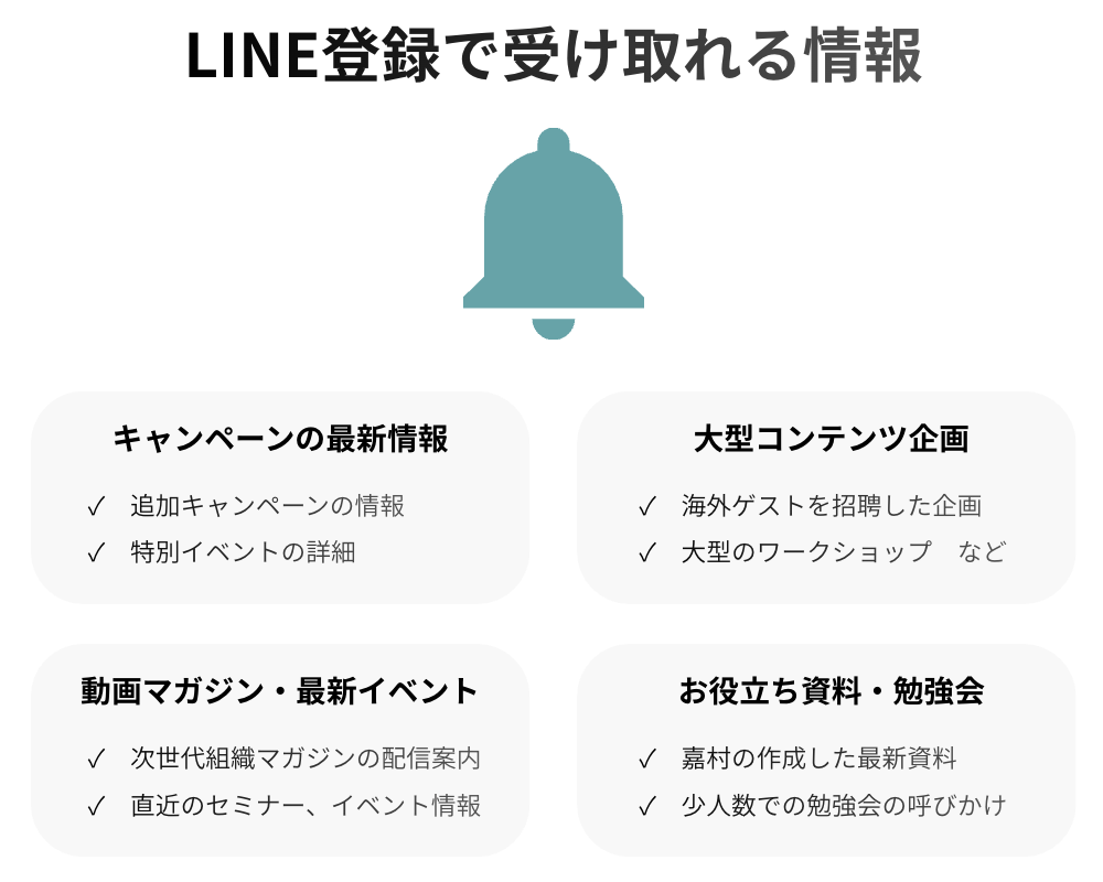 次世代組織に関する情報をお届けする公式LINEです。詳しくは下部をご覧ください。