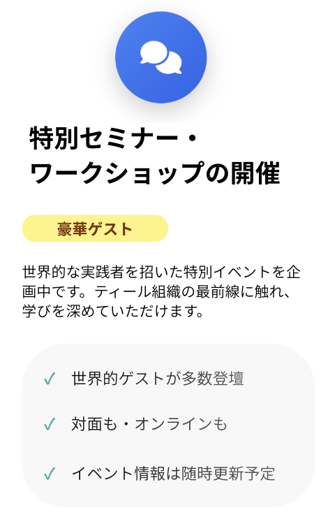 ティール組織やソース原理をテーマに、国内外の実践者を招いた特別セミナーやワークショップを開催しています。最新のイベント情報はこちらをご覧ください。(随時更新)