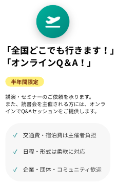 出版を記念し、読書会を開催される方向けに、30〜60分のオンラインQ&Aセッションを無料で実施 いたします。