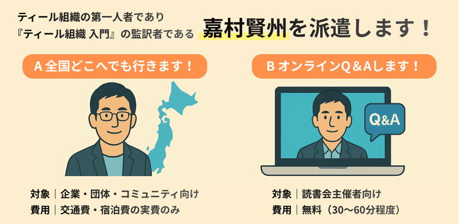 ティール組織の第一人者である嘉村賢州を全国どこへでも派遣します(交通費などの実費分はご負担ください)。また、この機会に新刊の読書会を開催される方向けに、オンラインでのQ&Aセッションを提供いたします。どなたでも気軽に学びの場を開くことができます。