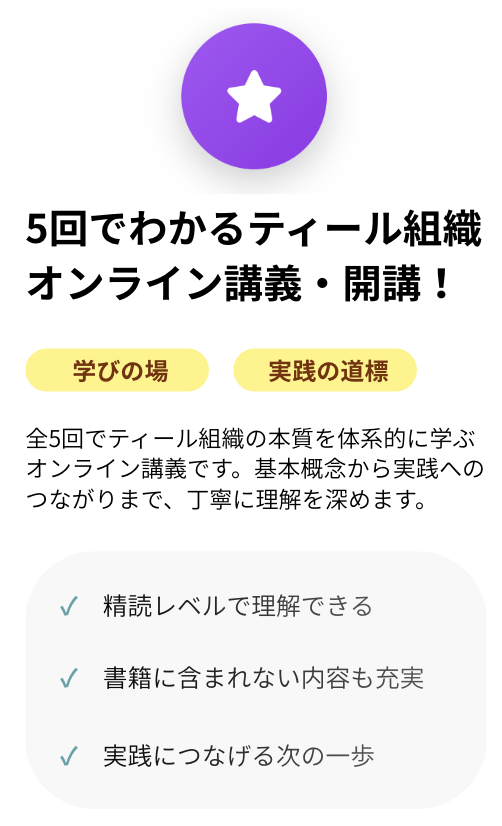 ↓↓↓「5回でわかるティール組織」オンライン連続セミナーの詳細・申込はこちら↓↓↓